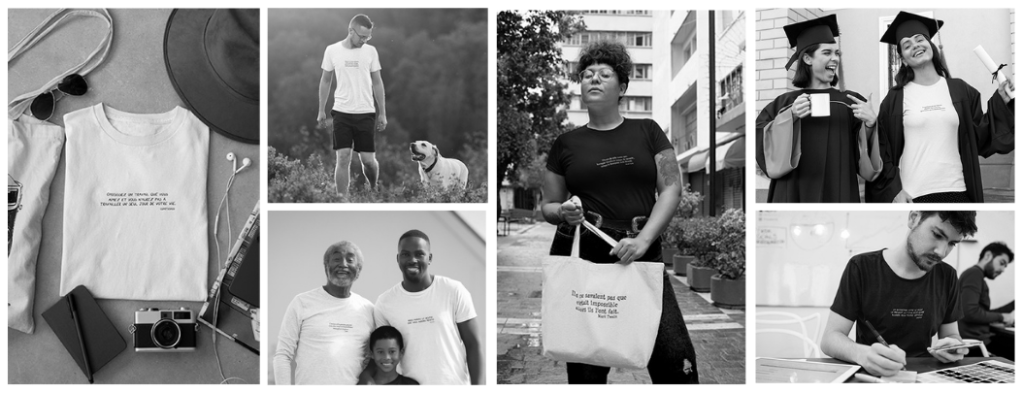 Ainsi, le vêtement, nécessaire tenue de l’Homme et devenu accessoire de mode, est ici utilisé pour passer un message, inciter à la réflexion, ouvrir le champ des possibles. Les phrases et citations proposées abordent différents sujets et thématiques ; le client est donc libre de choisir celui qui l’inspire le plus.
